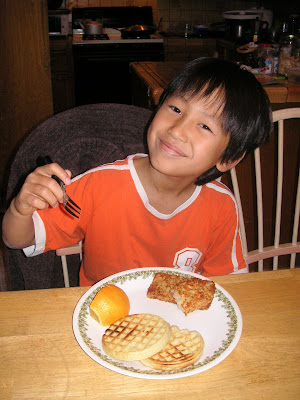 Starting the day off with his favorite breakfast foods, waffles and hashbrowns.